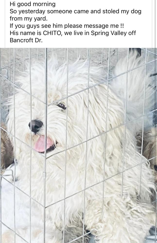 Pet Description:Chito is a 2 year old mixed Maltese. He is white and was stolen from my yard.. neighbors said they seen him tied 2 blocks down our house but when they came back out he was not there anymore. |