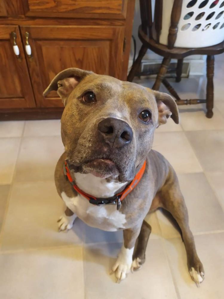 Pet Description:Medium build, light colored brindle with white chest and belly and white front paws. Floppy uncropped ears and uncropped tail. Brown eyes. |
