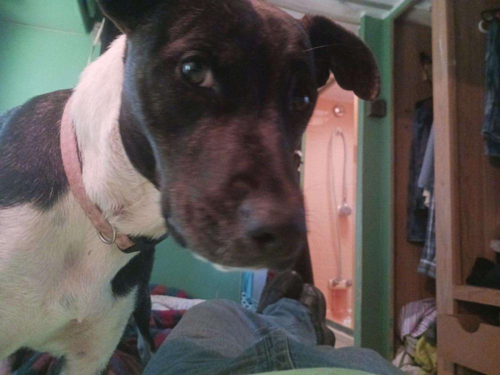Pet Description:35 lbs..white and Black with faint brindle markings. Wearing a pink collar.lilo was stolen and abandoned in the highlands river parking lot. |