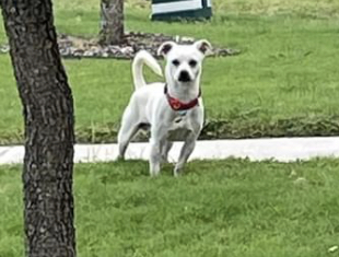Pet Description:All white with a hint of tan on his back. He has a red collar with a few bells on it. |