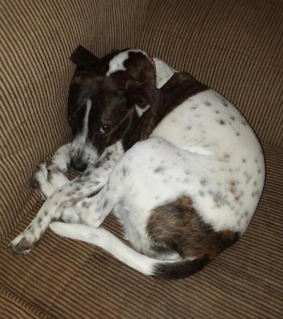 Pet Description:She weighs 38 pounds, is mostly white with brindle spots. She's spayed, not chipped, and doesn't have her collar on. Shes possibly injured. She's very skittish. |