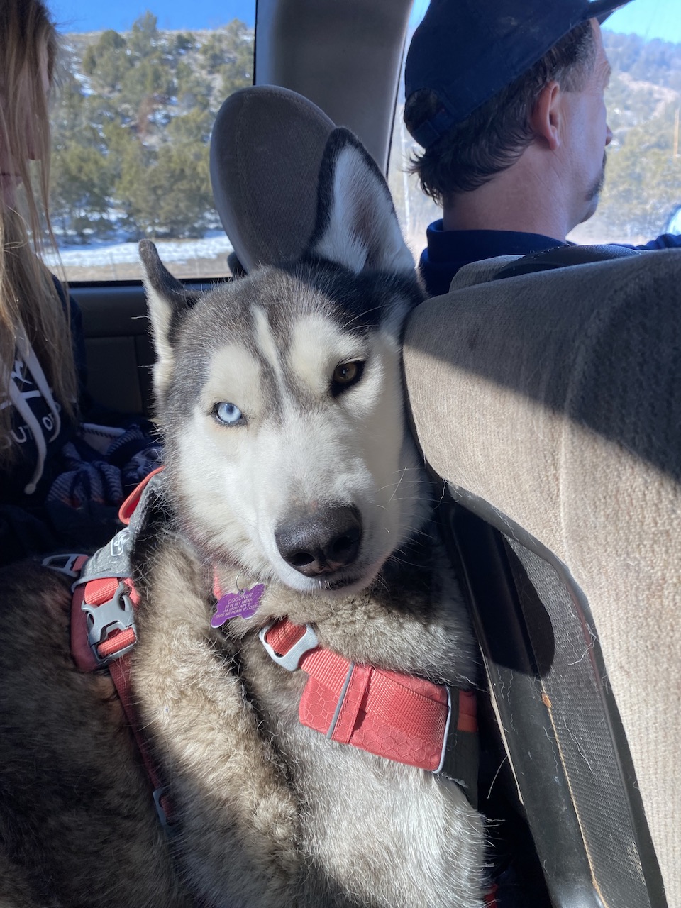 Pet Description:Contact 4805474491. She is 3 year old female Siberian husky, one blue and brown eye. Grey and white coat with a little bit of black. Has a pink and blue collar possibly with an outdoor cable attached to it. Medium sized dog |