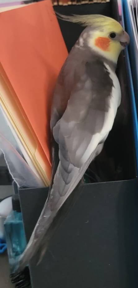 Pet Description:Cockatiel, grey body and yellow head, 2 orange dots on cheeks. A ring on his left foot. |