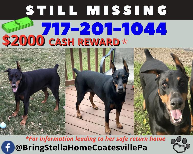 Pet Description:Stella 75lb black Doberman when she ran off chasing wildlife. Ears cropped Right ear flops but she can stand them both up. European docked tail. She was wearing red electric fence collar when she went missing. She is microchipped and fixed. Last sighting was October 2021. She could be anywhere or with anyone at this point. She is now 10years old, She’s our baby and we miss her terribly. Please if you have any information on her whereabouts please contact 717-201-1044. $2000 reward for info |