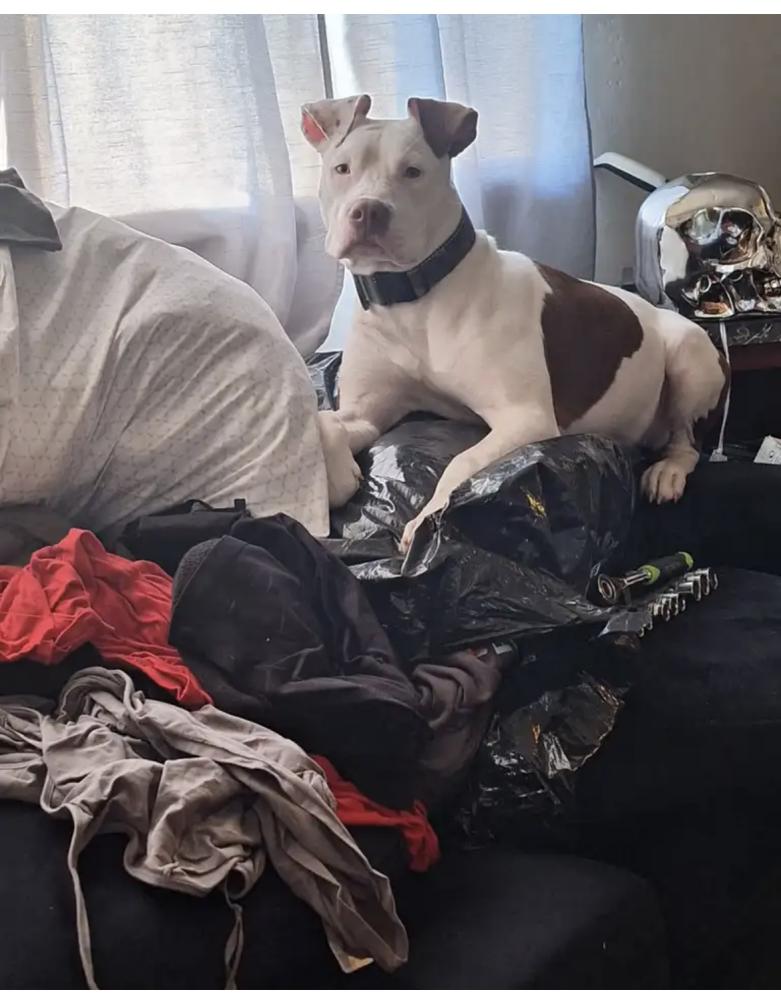 Pet Description:White w/brown spots. One ear is white the other is brown. She has brown that looks like a bra on her back and from the back one back leg is brown the other white. She’s 7 mos old 40/50 lbs |