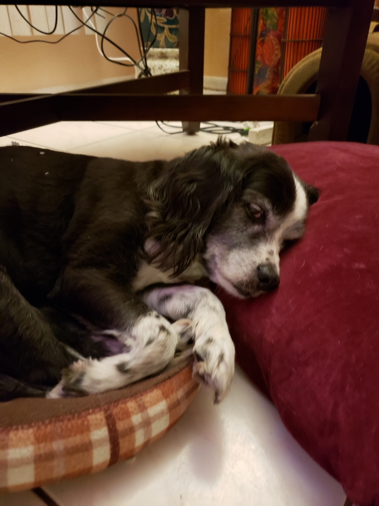 Pet Description:She is a Springer spaniel mix, medium size, wearing a red harness. She is 16 years old. |