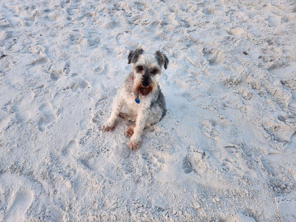 Pet Description:Gray & White Miniature Schnauzer, short hair on body and legs. 15 YRO Female, 13 lbs. DEAF, Half BLIND, Missing most Teeth. Frail, Feeble. Red Collar w/Blue Rabies Tag |