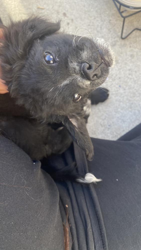 Pet Description:All back with white on the tip of her tail, back of her neck, under her chin, chest, line up her nose, short hair that looks like it can be wavy if it was long, longer hair on her ears and slightly wavy, white tips on her back toes |