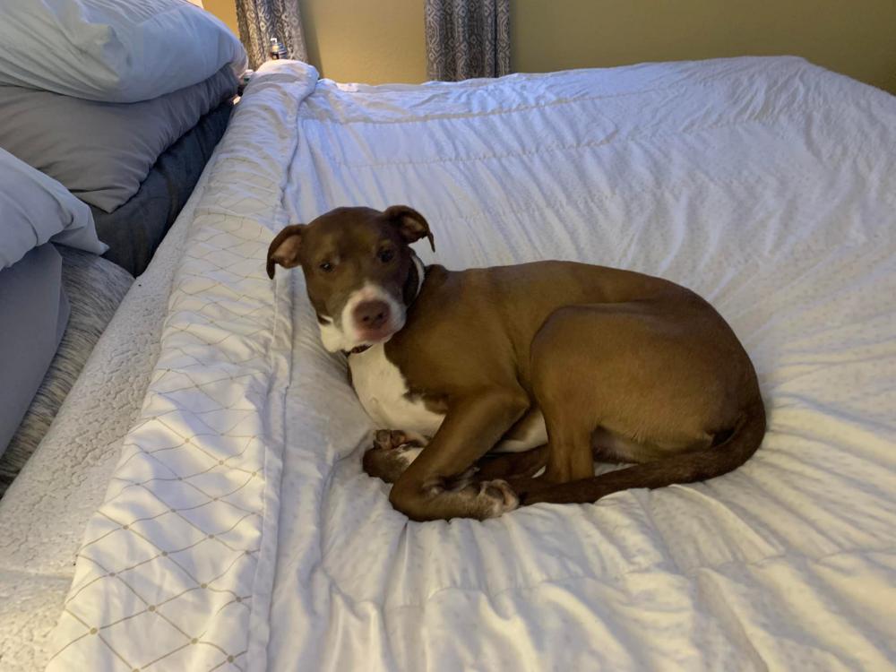 Pet Description:HE IS BROWN(REDDISH) AND WHITE WITH A RED COLLAR. APPROXIMANTLY 55 POUNDS AND 9 YEARS OLD |