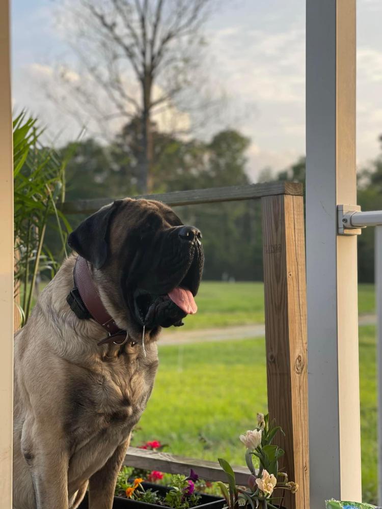 Pet Description:He’s a 240 pound(roughly) sandy brown dog with a black face. He stands about 6ft on two legs and 3 ft on all fours. |
