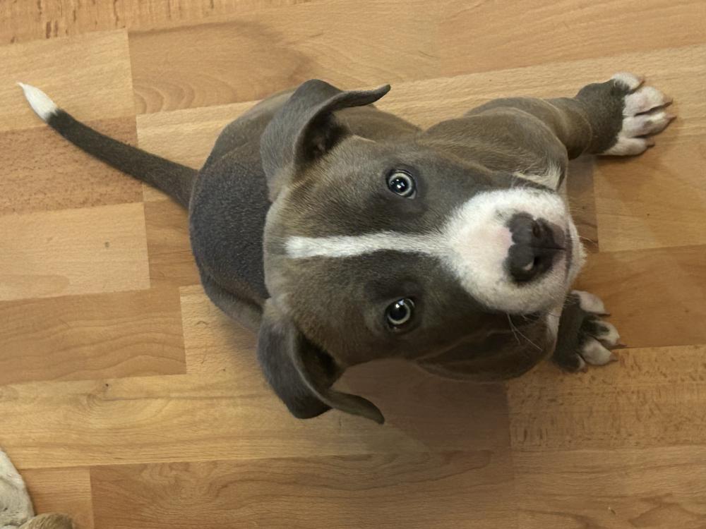 Pet Description:About five months, old, gray with white feet white on tip of the tail and a white J going down neck |