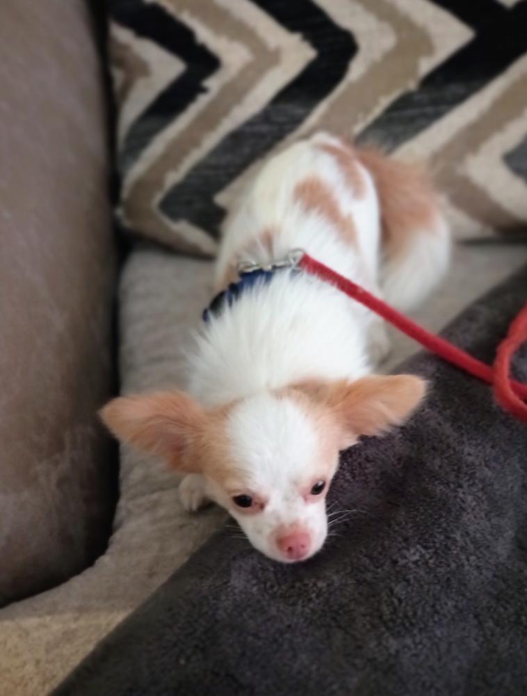 Pet Description:White and gold Chihuahua mix. Blue harness, and red leash. Freckles on paw and face |
