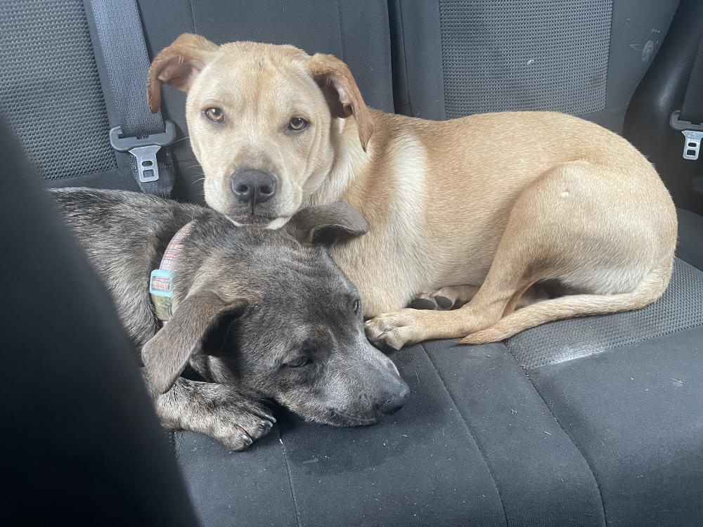 Pet Description:Two male medium sized dogs, neutered, with collars on which had no identifying info. One is golden and the other is Smokey brindle. |