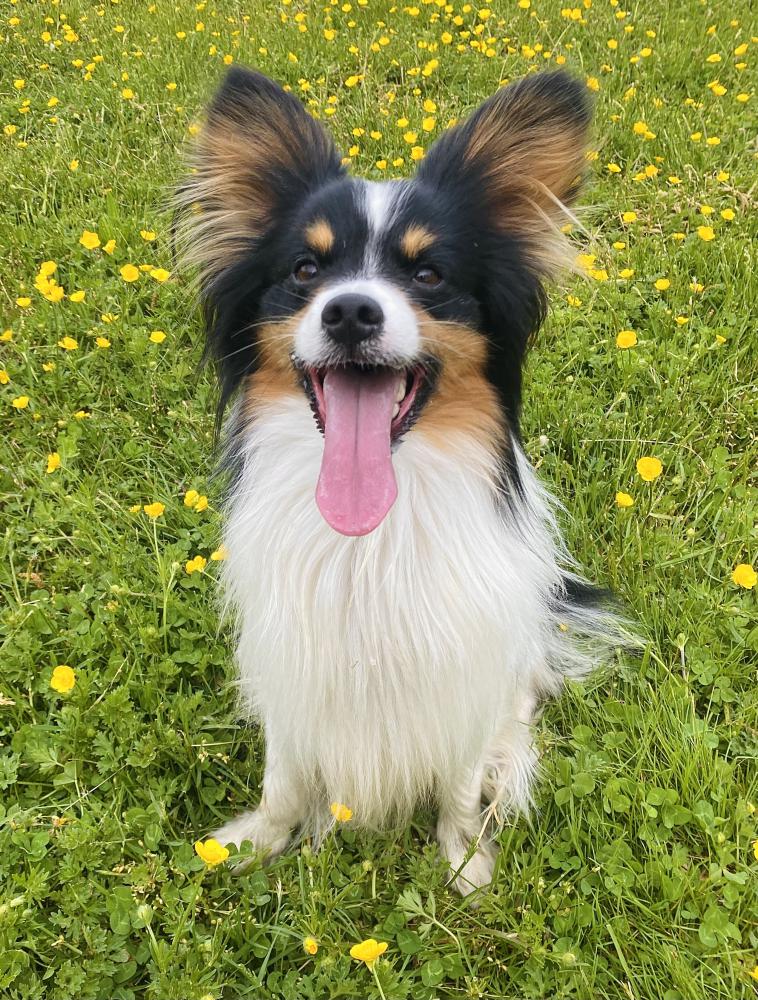 Pet Description:Randy is a 12 pound papillon with large ears and a fluffy tail. He has long hair. He is mostly white with black and some brown around face. |