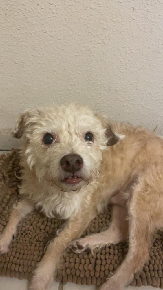 Pet Description:His name is Rufus, he's male. He's a blonde/ light colored terrier mutt of some sort. I rescued him a while ago so I can't be sure the breed. He has lot's of hair right now, little darker hair around the mouth. Black/dark brown nose. Pink on the inside of his ears and lips/gums. He has a small gap in the bottom row of his teeth (noticeable when he's smiling) He's fixed. He has dark brown eyes and even darker pupils. |
