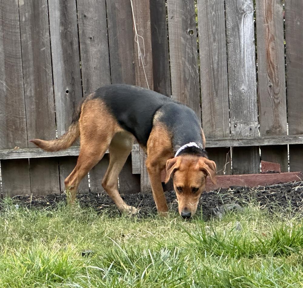 Pet Description:Female, no tags, no chip. Maybe a year or year and a half old. She looks like either hound/German shepherd mix or Rhodesian ridgeback. She’s safe with me. |
