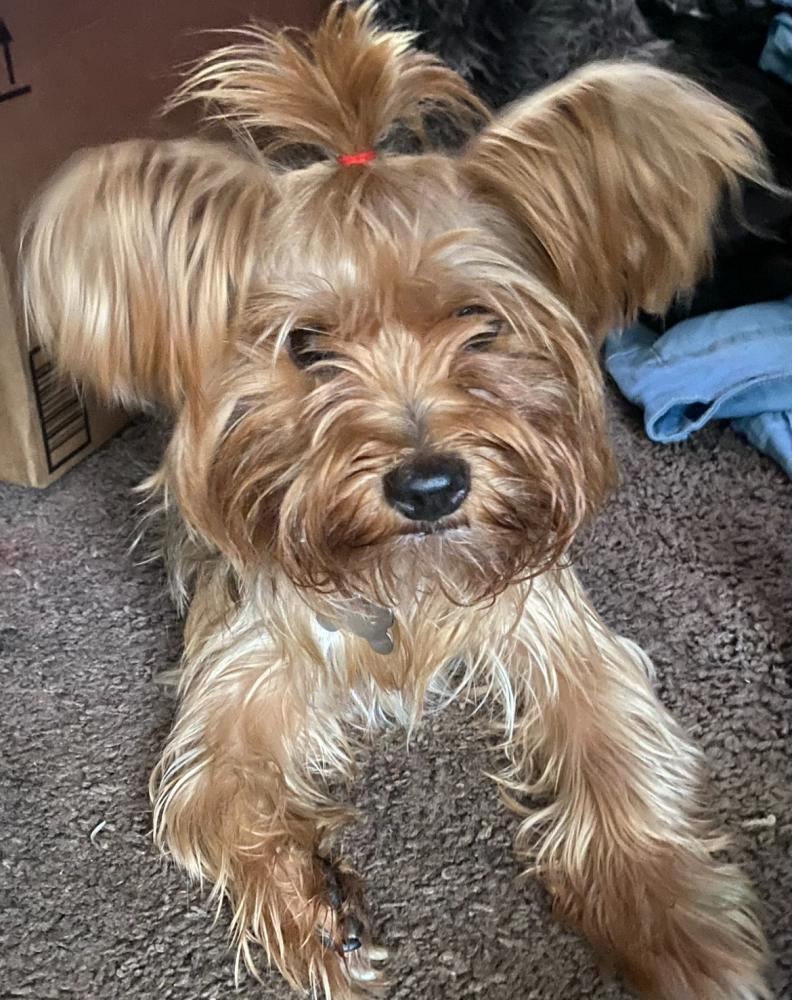 Pet Description:Small has a white flea collar very friendly shaggy brown and grey hair. |