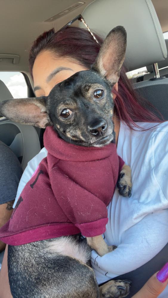 Pet Description:Margarito is a 2 years old chihuahua mix, 11 lbs, male, black with brown paws. He’s a very friendly and affectionate dog. |