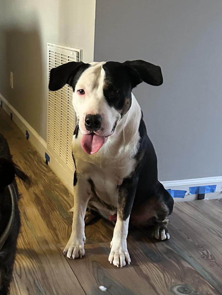 Pet Description:Mixed Pit, male, not neutered, black and white, young, no collar and no microchip. Very gentle and loving, very skiddish |