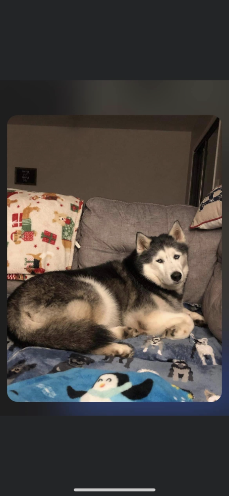 Pet Description:Medium sized black and white female husky with a white face. Has a small rough patch on black nose with bright blue eyes. 10 almost 11 years old. |