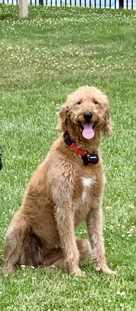 Pet Description:My dog is a red labradoodle that weighs 73 pounds. She is very gentle and skittish. She is wearing a collar for an electric fence that is red. Her buddy Georgie missed her very much. I do too |