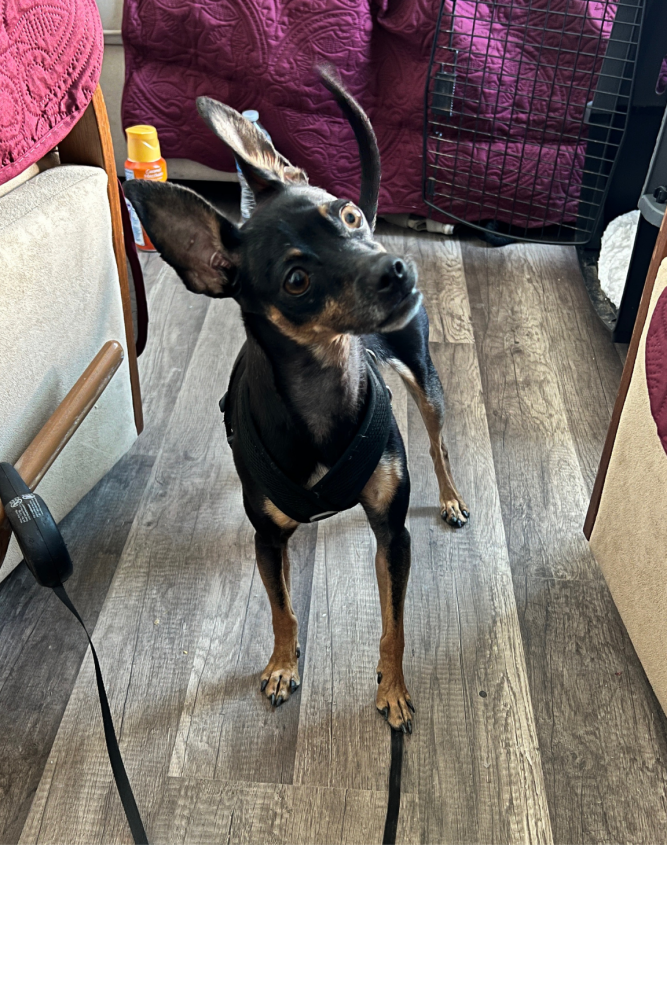 Pet Description:Rue looks like a Miniature Pinscher, but smaller. She's a Chihuahua mix - not sure what she is exactly. Last seen wearing a black harness. She was in her kennel - which was inside another kennel - and she still managed to slip away. She's skittish but curious. |