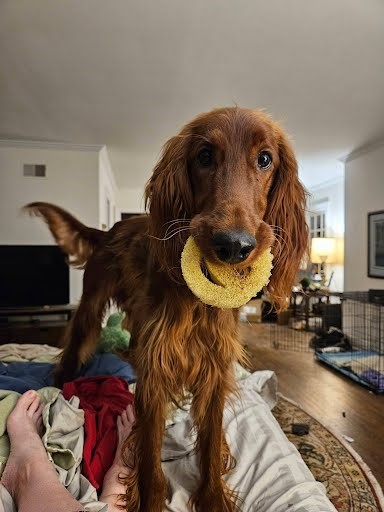 Pet Description:Mahogany Irish Setter, fast, friendly. Likely to approach and play. May be scared of unusual objects: hats, etc. |