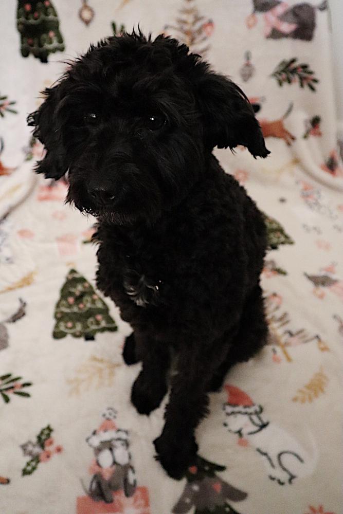 Pet Description:Small mini labradoodle Black coat all over with two white spots on her chest and chin . |