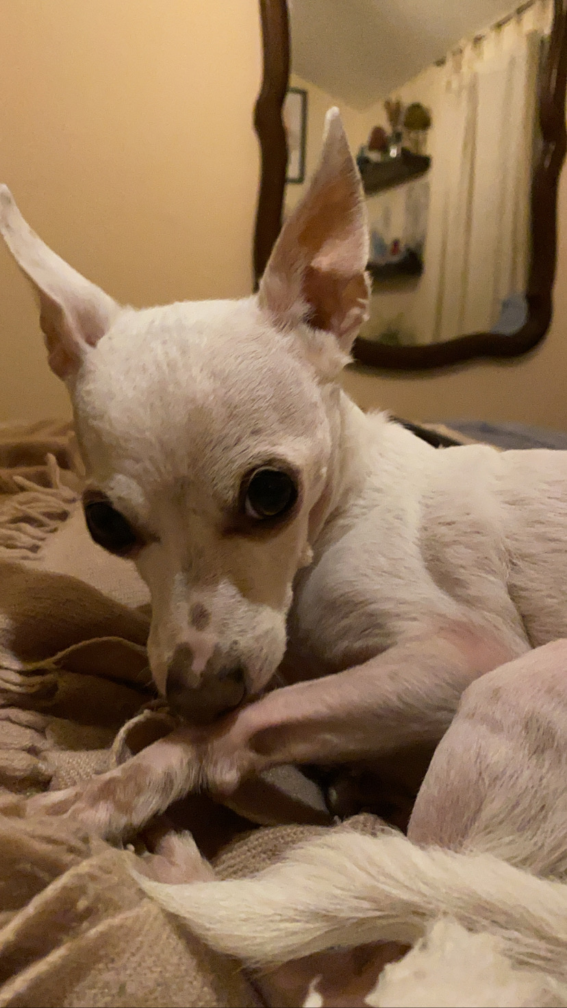 Pet Description:Finn is a 9lb white chihuahua. He only has 3 teeth. He’s around 10 years old and is very friendly. He is micro chipped but no collar. He will come if you call him. |
