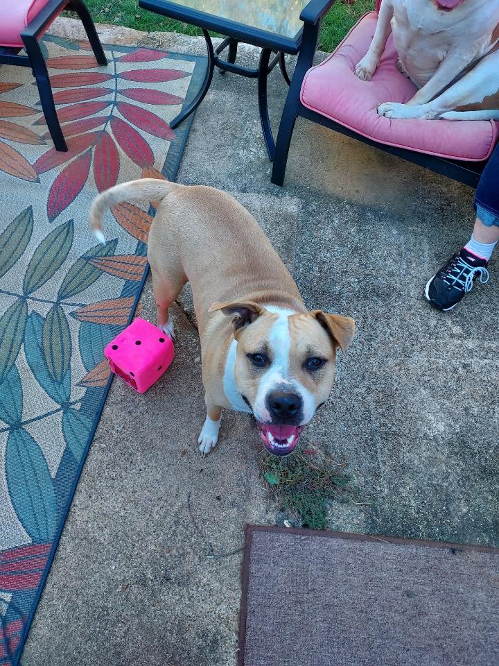 Pet Description:She is primarily tan and white. However, she has a faded black streak going up the separation between her eyes and her eyes look like she has black eyeliner. she weighs around 45 pounds |