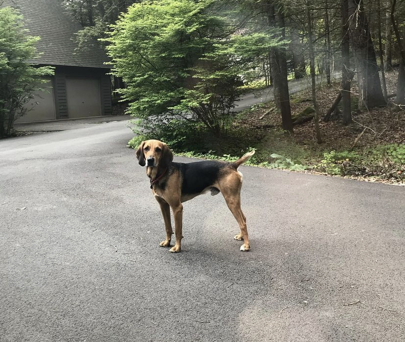 Pet Description:Cooper is a friendly hound wearing a red and black checkered collar. He is black and brown, and weighs about 52 pounds. He has a very short tail. |