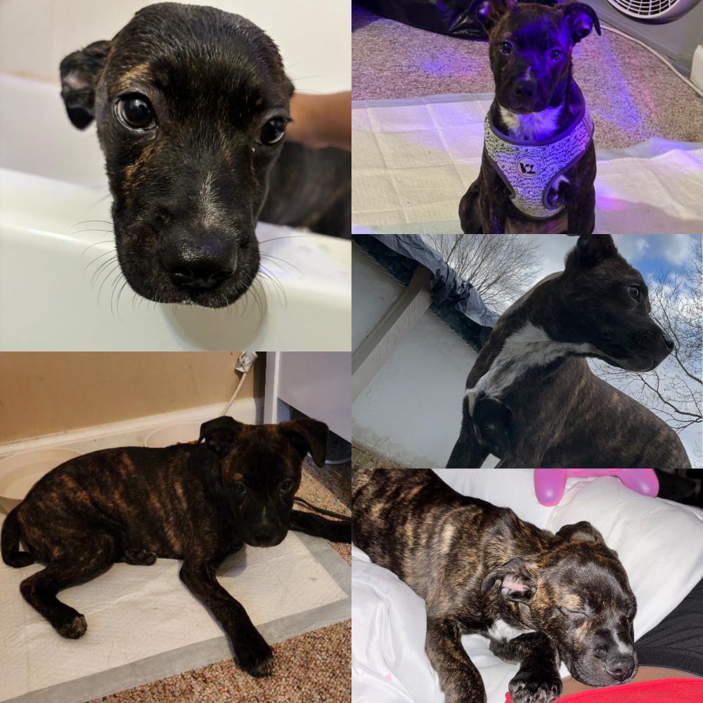 Pet Description:Luna is a female Boxer and Pit mix puppy with black and brown brindle and a white chest. She’s chipped with my boyfriend’s info and her name being Scar and is spayed. |
