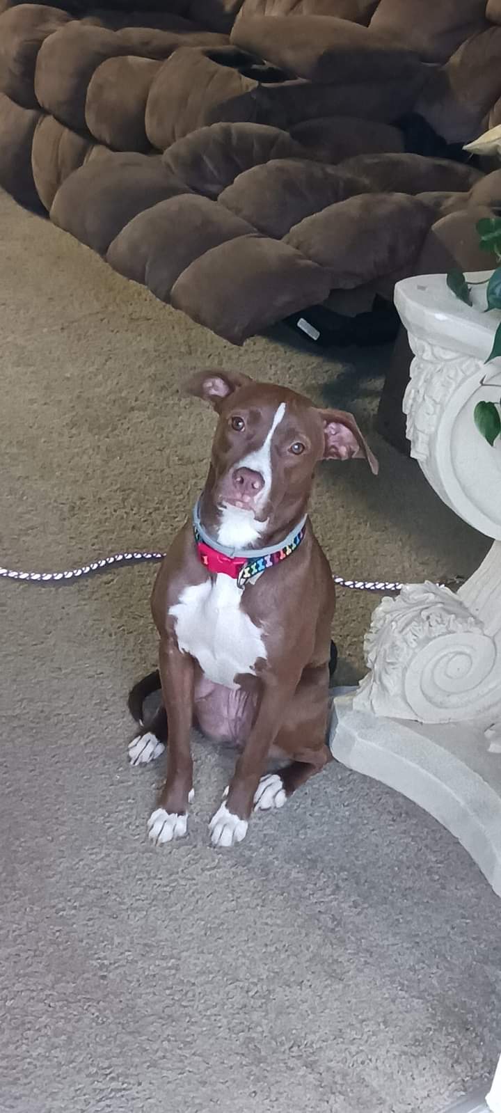 Pet Description:Brown with white stripe on her face white chest and white paws |