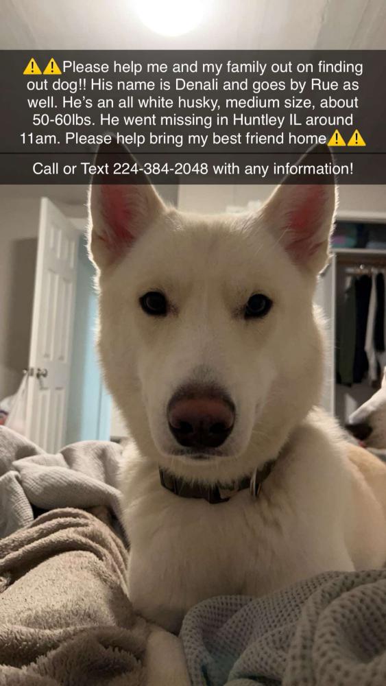 Pet Description:Goes by Rue as well. Medium size dog, brown eyes, all white fur, 50-60lbs. |