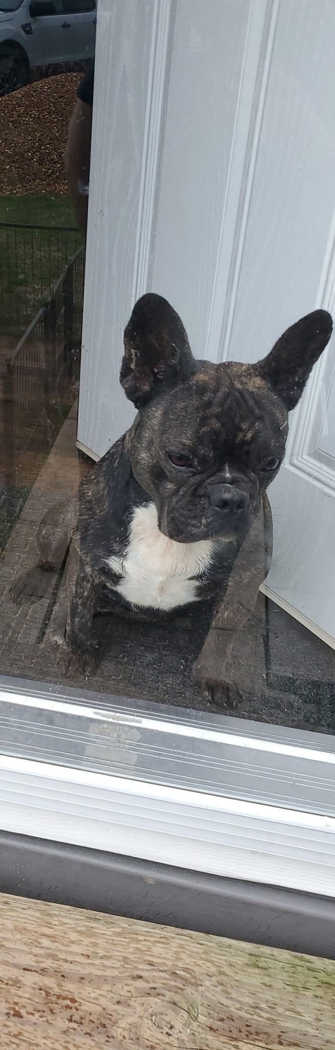 Pet Description:Small black, with brindle marking and a white chest And a white strip down her nose female french bulldog. Has been fixed. Cokes to the name maemae |