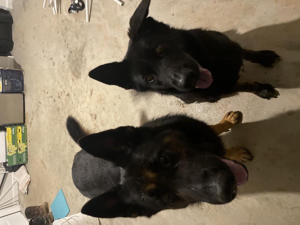 Pet Description:Female intact GSD, mostly black with some tan on feet and legs and small white spot on chest and one floppy ear. Found with larger intact male GSD with mostly black and some brown. |