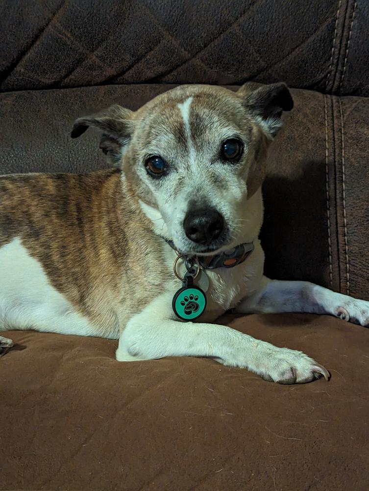 Pet Description:14 year old brown/ brindle and white rat terrier., about 15 pounds. He is deaf but very friendly. |