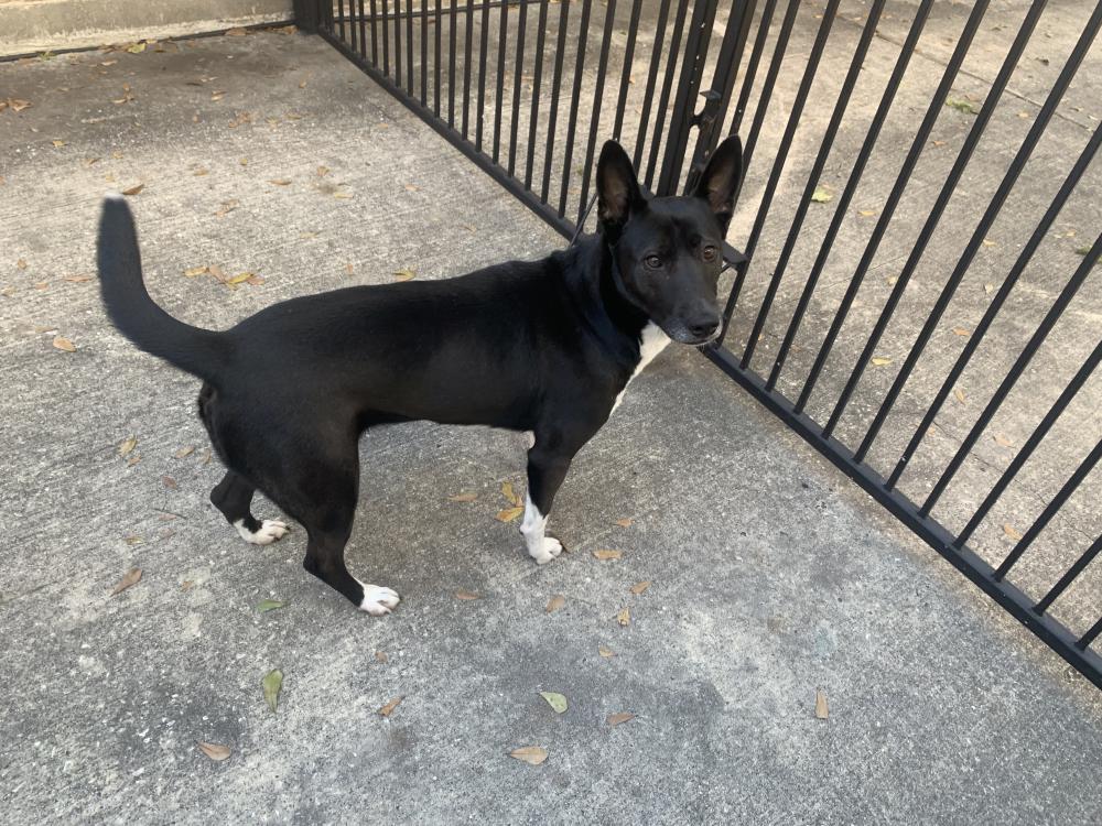 Pet Description:Black and white basenji/german shepherd mix, ~45 lbs, short coat, no chip, no collar, very smart |