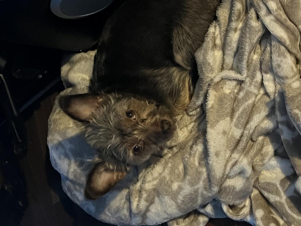 Pet Description:Dark brown with some grey on face. Light brown eyes. |