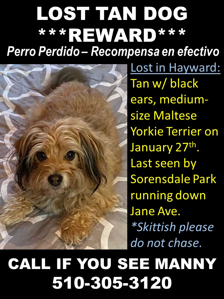 Pet Description:Tan with black ears Maltese Yorkie Terrier - medium size. Wearing a blue collar, his tag came off. Last seen running down Jane Ave towards Harder Rd. He's skittish, so please don't chase him. Call if you see Manny. |