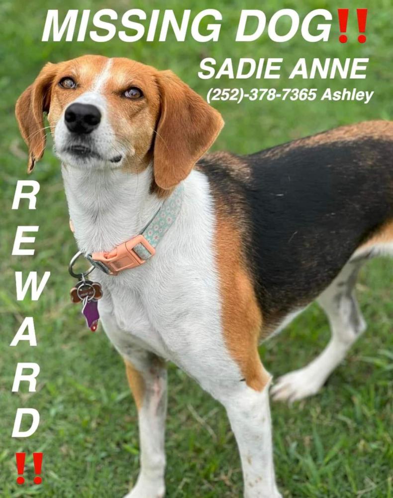 Pet Description:Description: Sadie Anne is a tri-colored hound. She has a split on the bottom of her right ear! |