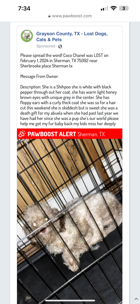 Pet Description:She is a Shih-poo/Shih-Doodle she has a curly thick white coat with brown and black peppered thro out she has brown floppy ears( don’t stand up) she has the most unique light warm honey brown eyes with grey in the center she is a year old she is sweet but timid may run if frightened and will pee a little she went missing on Sherbrooke Place Sherman tx by the new high school please help us find my fur baby |