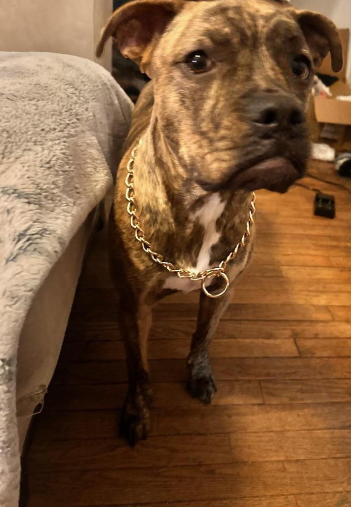 Pet Description:She is brindle with a white patch on her chest she is very sweet her name is wiggles |