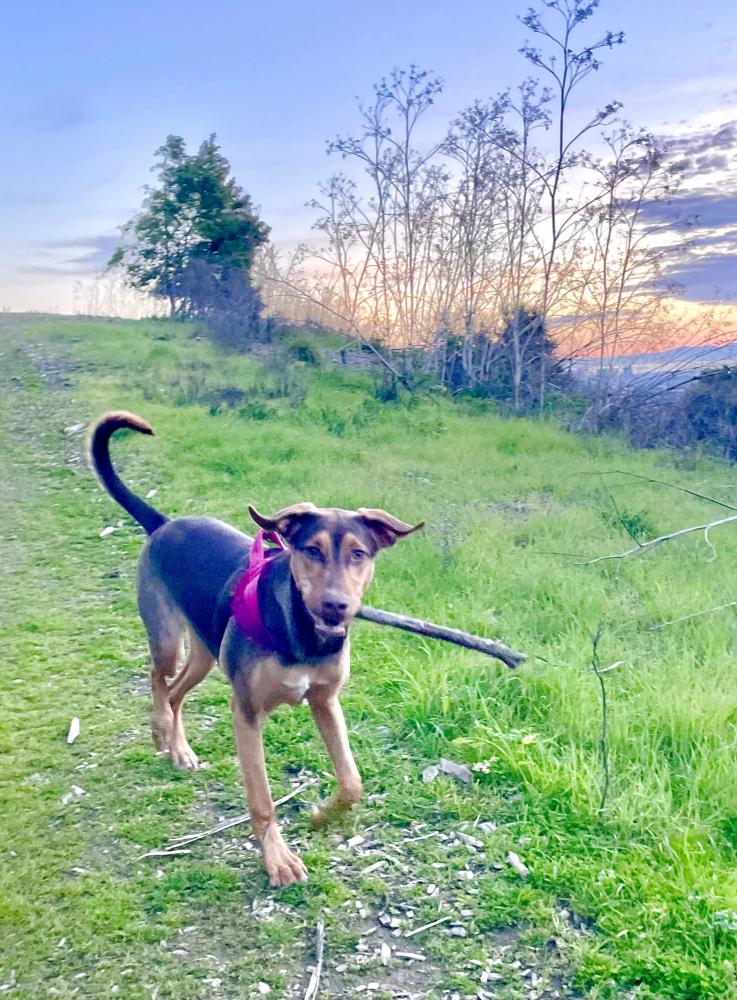 Pet Description:8 month old Doberman mix about 60lbs and wearing a pink harness |