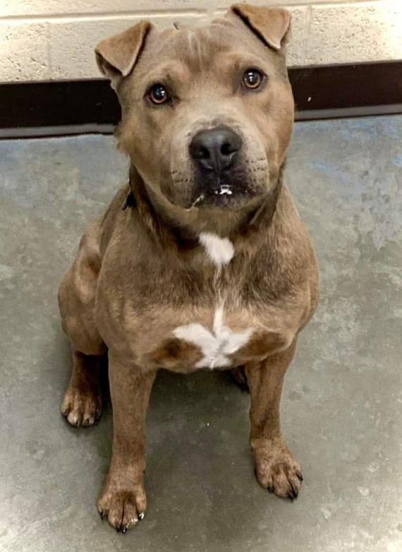 Pet Description:48 lb American Brown Bully with white markings, long tail. Ears are bent forward. Anytime I sit down he tries humping me. He knows commands. Leash strong. Doesn't want anyone near food. |