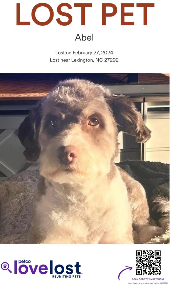 Pet Description:Mini Aussie Doodle, our beloved pet, friendly, unfamiliar with area just moved here few months ago. |
