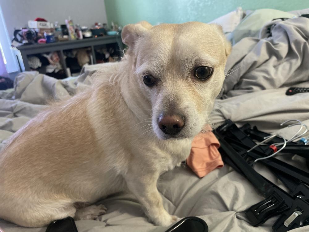 Pet Description:Slightly heavy, very low to the ground, four-year-old male Chihuahua mix. He is shorthaired and a light cream colored. He is wearing a light blue collar. Around 25 pounds. Only 4 years old. He is super sweet but may growl if he gets nervous. |
