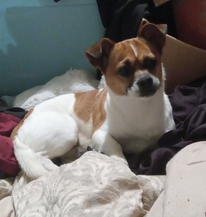 Pet Description:Small male mixed breed came up on my porch and is now in my garage laying on a pile of blankets. |