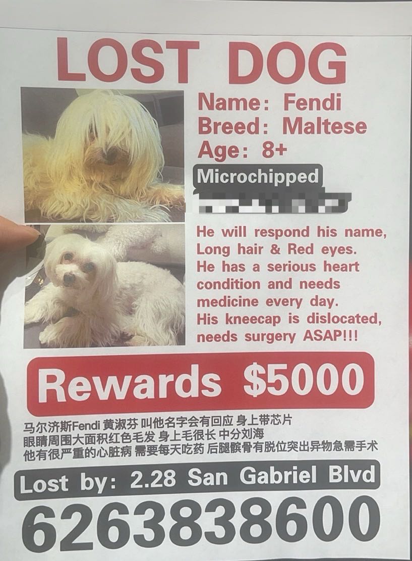 Pet Description:Still Missing Lost Dog????Fendi my baby Lost on 2.28.2024 because of my friend who didn’t close the door carefully. Now almost half month they gave up finding him. So please help me. ??Lost@location?Near 1016 s san gabriel blvd san gabriel ca 91776.??Last Seen 2.27 night??PLEASE?If anybody see or bring him home?please contact me ASAP. He needs medication everyday because his heart disease and his kneecap needs surgery. ??He will response his name and very friendly. He’s microchipped. He’s 9 year |