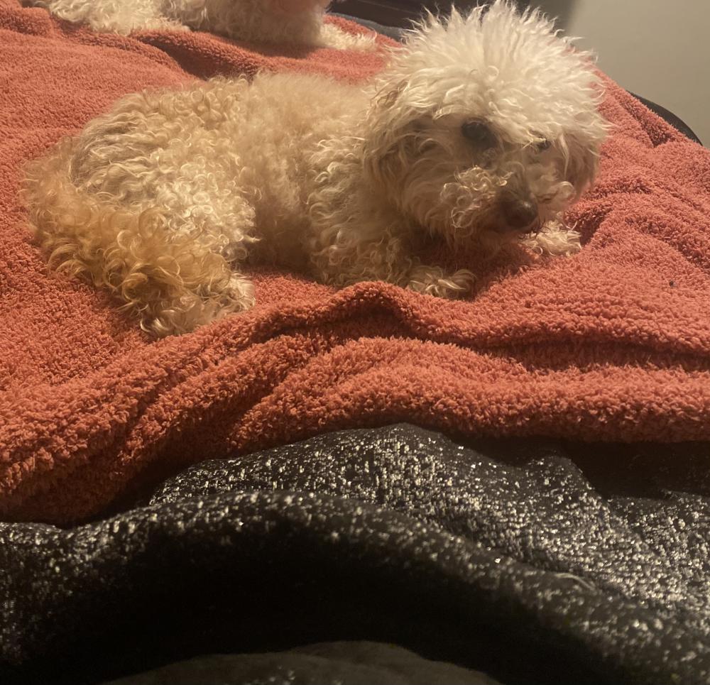 Pet Description:Bichon poodle about 13 years old. Tan cream color, no collars on was about to be groomed, thin curly matted hair. She has two daughters awaiting her return. |